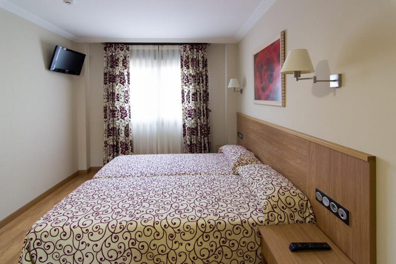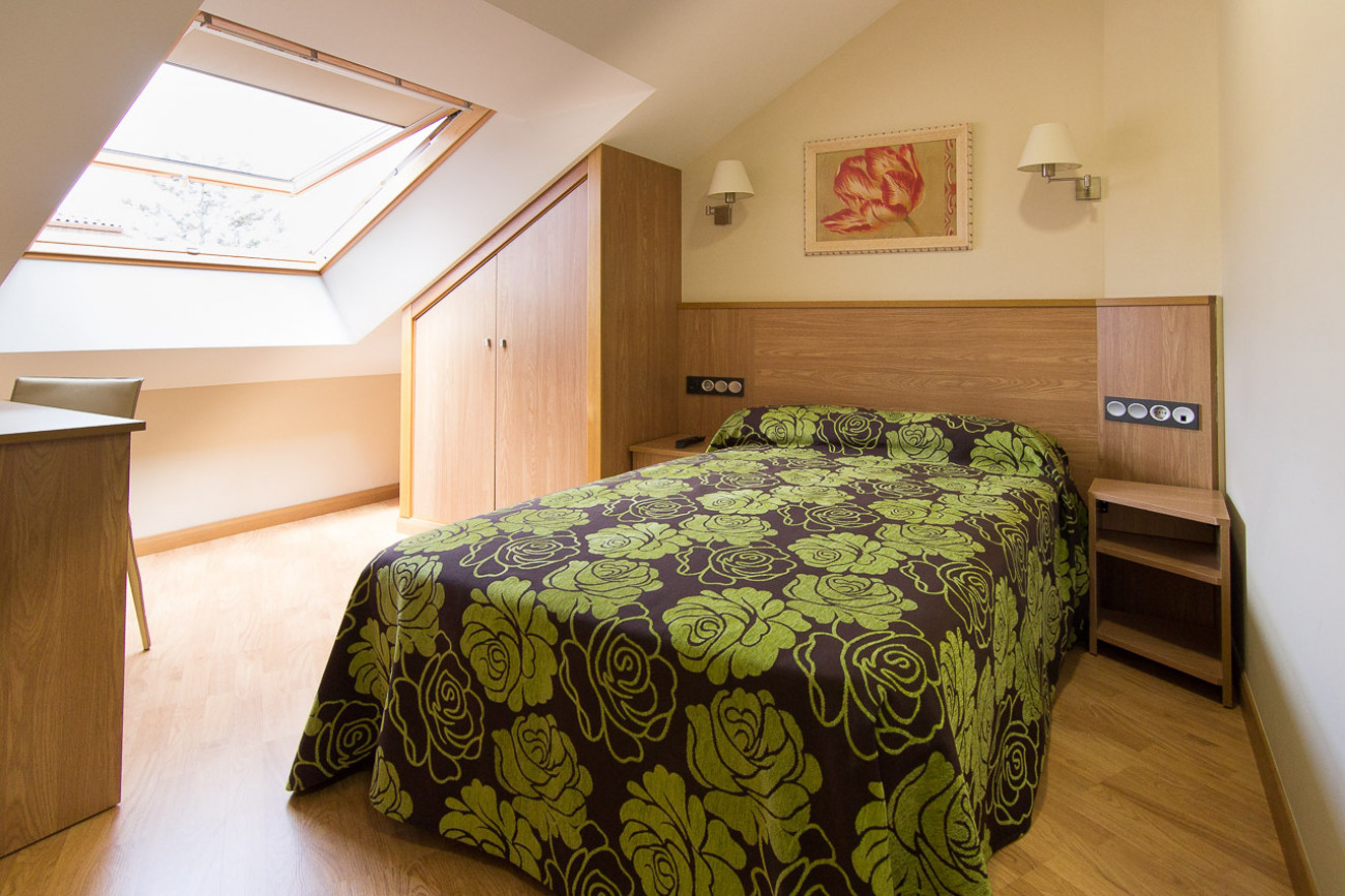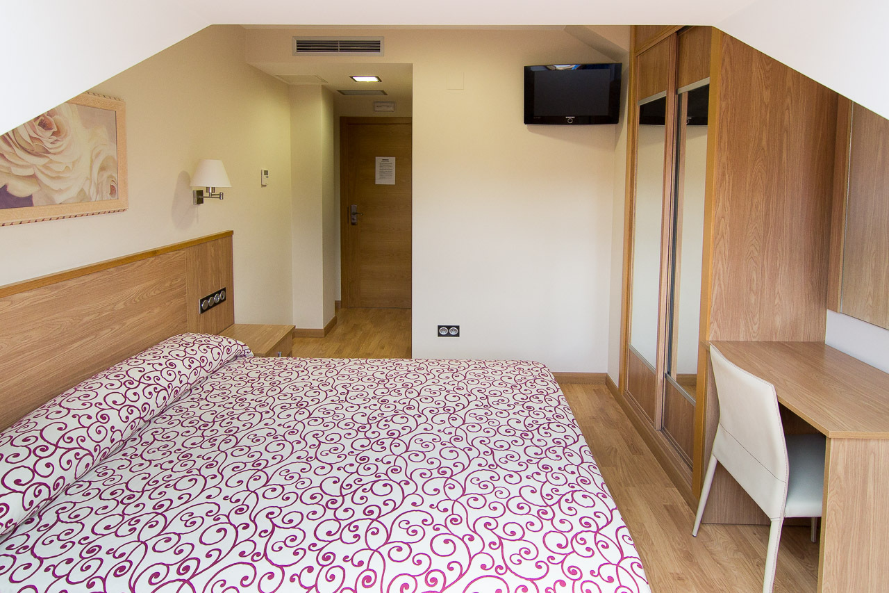 Habitación con una cama doble o dos individuales, cómoda y funcional. Dispone de baño privado con secador, calefacción, TV de pantalla plana, escritorio y wifi. Ventanas a la vía principal o a la zona residencial.